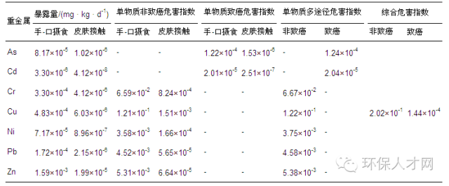 基于健康風(fēng)險(xiǎn)評(píng)價(jià)模型及相關(guān)參數(shù)指標(biāo),利用污泥中重金屬檢測結(jié)果對(duì)污泥的重金屬健康風(fēng)險(xiǎn)進(jìn)行評(píng)價(jià),兒童健康風(fēng)險(xiǎn)評(píng)價(jià)結(jié)果與成人健康風(fēng)險(xiǎn)評(píng)價(jià)結(jié)果分別如表 9和表 10所示.對(duì)于目標(biāo)暴露人群為兒童,以手-口攝食為暴露途徑時(shí),單一物質(zhì)非致癌危害指數(shù)高的元素是Cu,危害指數(shù)為1.21×10-1;以皮膚接觸為暴露途徑時(shí),單一物質(zhì)非致癌危害指數(shù)高的元素同樣是Cu,其危害指數(shù)為1.51×10-3,各重金屬對(duì)非致癌風(fēng)險(xiǎn)貢獻(xiàn)率從高到低的順序是Cu > Cr >Zn> Pb > Ni.污泥重金屬非致癌綜合危害指數(shù)為2.02×10-1,致癌綜合危害指數(shù)為1.44×10-4,其中,以手-口攝食為暴露途徑時(shí),其非致癌與致癌風(fēng)險(xiǎn)分別是2.00×10-1和1.42×10-4,以皮膚接觸為暴露途徑時(shí),其非致癌與致癌風(fēng)險(xiǎn)分別是2.62×10-3和1.78×10-6,手-口攝食暴露途徑為主要的暴露途徑.本次污泥金屬健康風(fēng)險(xiǎn)評(píng)價(jià)研究中,非致癌綜合危害指數(shù)為1.09×10-1,并未達(dá)到非致癌風(fēng)險(xiǎn)警戒值“1”,對(duì)于兒童來說并不存在非致癌風(fēng)險(xiǎn);污泥重金屬致癌綜合危害指數(shù)為1.44×10-4,超出USEPA提供的可接受區(qū)間(1×10-4 ~ 1×10-6),存在一定的致癌風(fēng)險(xiǎn).但需要指出的是,為了揭示大的致癌風(fēng)險(xiǎn)值,該研究是假設(shè)長期生活在布滿污泥的環(huán)境中,因此,實(shí)際生活中,可能并不存在致癌風(fēng)險(xiǎn).