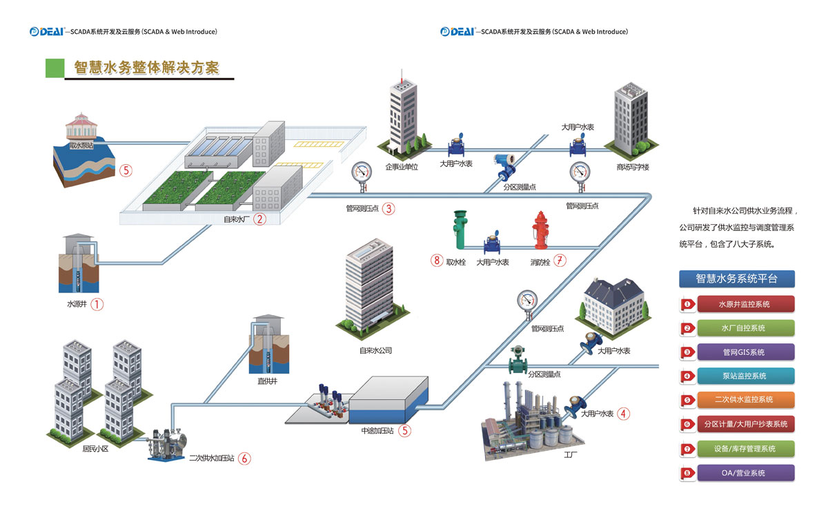 德艾智慧水務系統是本公司完全自主研發,基于華通水務調度系統的既有平臺,通過標準化的建模和編碼規范,采用云計算、物聯網、大數據等先進技術,實現了將現有信息系統的整合和統一管理,打破了傳統業務功能子系統獨立建設、獨立運行的格局,構建成一個統一的平臺,將過去局限性信息傳遞至整個集團公司,將標準化和信息安全作為系統建設和互聯互通的基石。